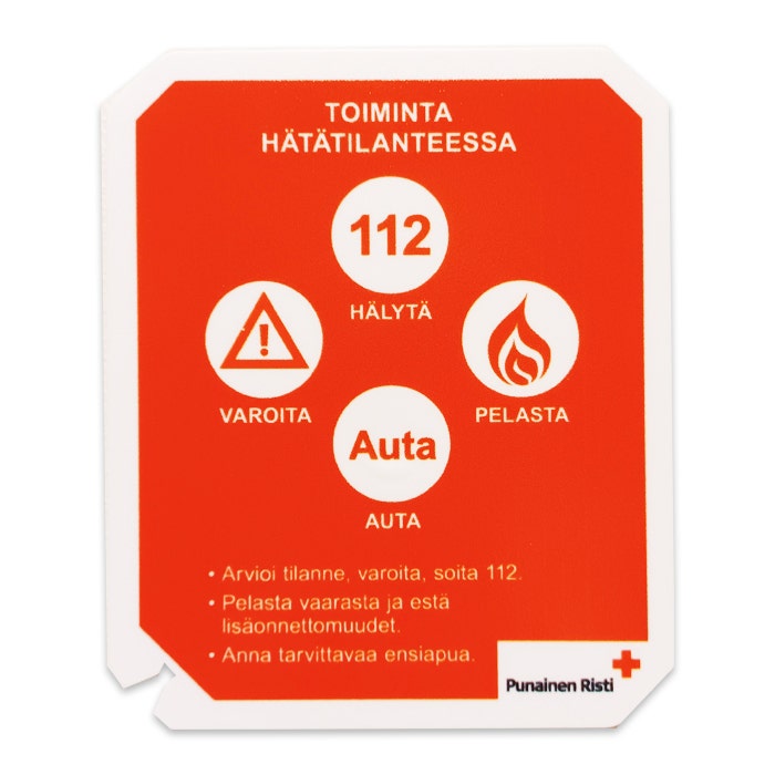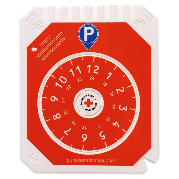 Tässä parkkikiekossa on monta tuotetta yhdessä: ajannäyttö, jääskrapa, ura tuulilasinpyyhkijöiden putsaukseen, renkaiden urasyvyyden mittaamisen apumitat sekä kääntöpuolella Punaisen Ristin ensiavun asiantuntijan laatima ohje miten toimia hätätilanteessa.