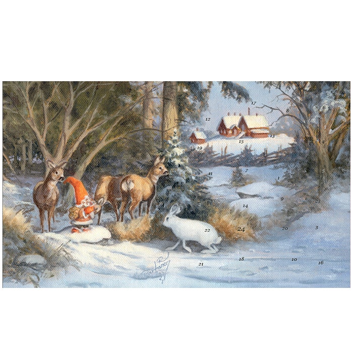 Perinteinen Raimo Partasen kuvittama joulukalenteri, jossa taianomaiset hahmot seikkailevat luukkujen takana. Pöydällä seisova malli.Valmistaja: Paletti... Lue lisää Näytä vähemmän