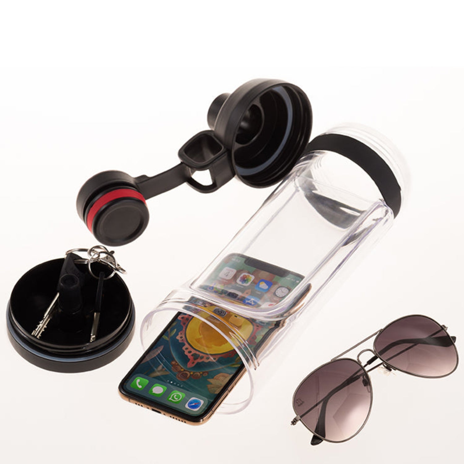 Mallisuojattu! Tässä on täydellinen juomapullo rannalle tai ulkomaan matkoille. Sen avulla suojaat omaisuutesi piilottamalla ne näppärästi juomapulloon. Jemma juomapullo sisältää kaksi eri osaa: pohjasta aukeavaan osaan voit laittaa puhelimen, pankkikortin ja avaimet ja päältä aukeavaan osaan voit lisätä veden. Kaikki tarvittava kulkee helposti mukana!