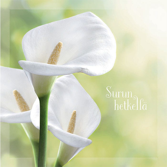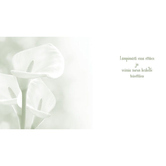 Ett kondoleanskort med en vacker bild av en kalla. Text på insidan är på finska... Lue lisää Näytä vähemmän
