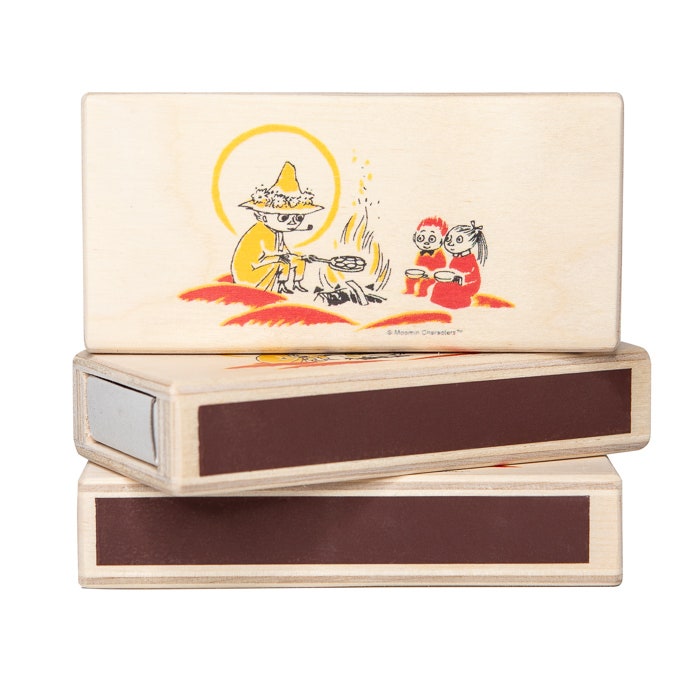 En tändsticksask med Snusmumriken vid en lägereld med små vänner. Innehåller 2 små askar med tändstickor. Fodralet av björkfaner har en tändyta.
