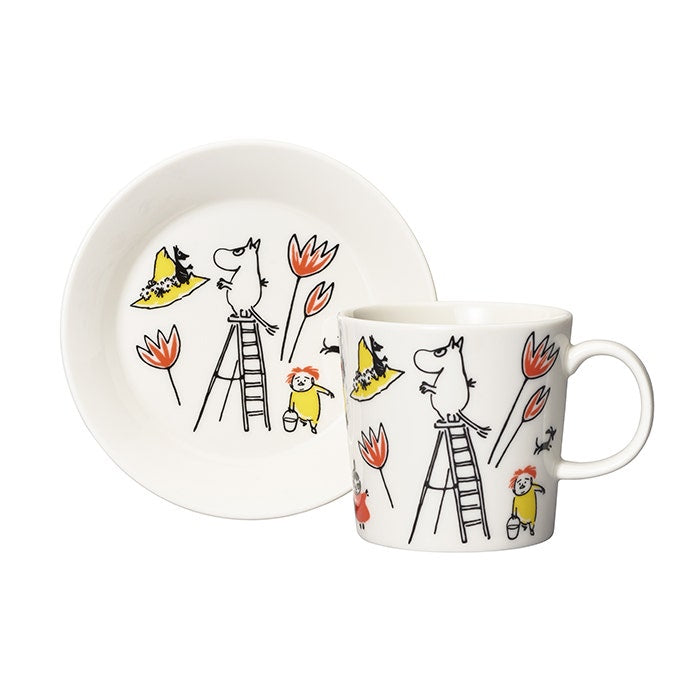 Förpackningen innehåller en Mumintrollet på stegen -mugg 0,3 l och en Mumintrollet -tallrik 15 cm.