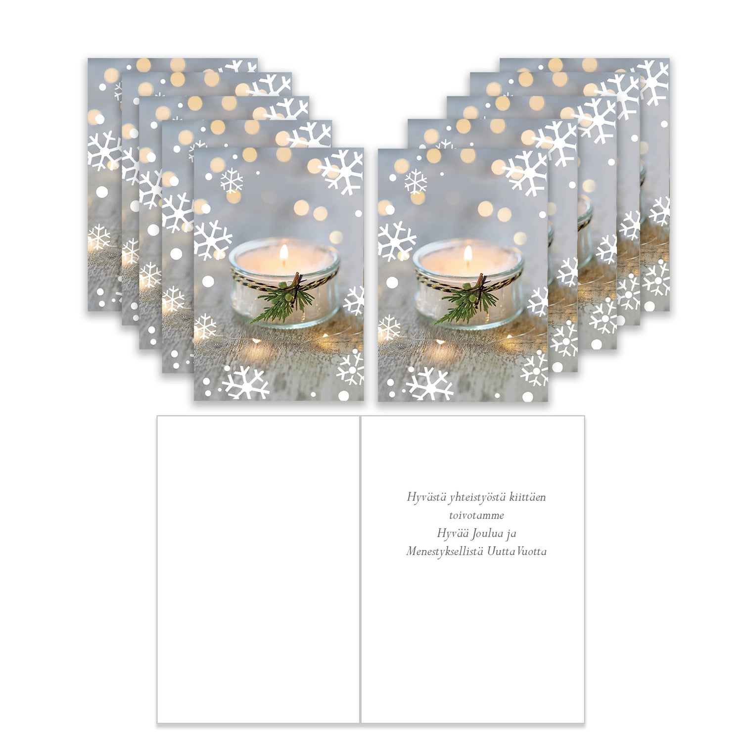 10 vikbara julkort utan kuvert. Text på finska "Hyvästä yhteistyöstä kiittäen toivotamme Hyvää Joulua ja Menestyksellistä Uutta Vuotta".