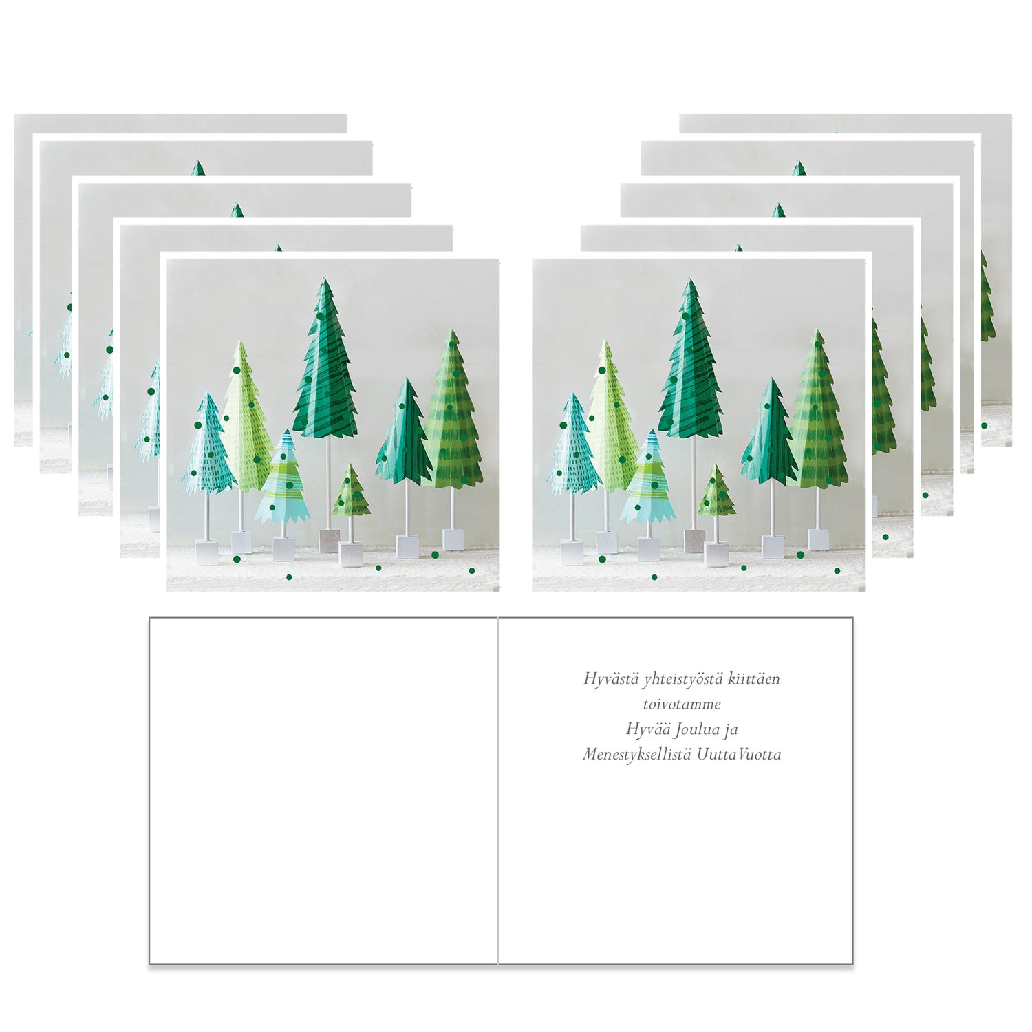 10 vikta julkort med finsk text "Hyvästä yhteistyöstä kiittäen toivotamme Hyvää Joulua ja Menestyksekästä Uutta Vuotta".
