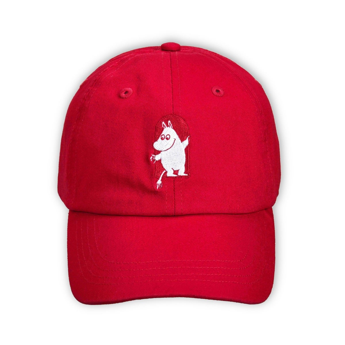 Röd keps med Mumintema. Kan justeras till 51-59 cm huvud.
