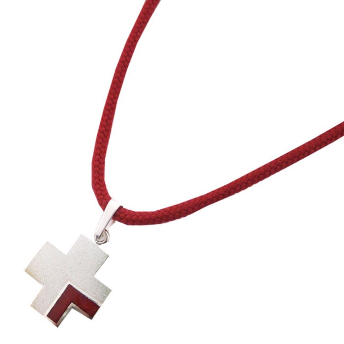 Ett elegant hängsmycke med silverkors. Bandet är rött. Smycket har designats för Finlands Röda Kors av Maria Suikkanen. Tillverkad av Kultakeskus Oy.