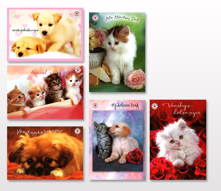 6 olika djurkort. Skicka ett alla hjärtans dagskort till din svenska vän med söta kattungar och valpar! Porto betalas till alla länder.