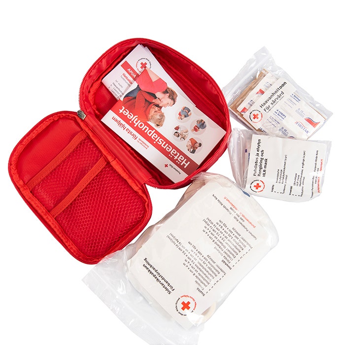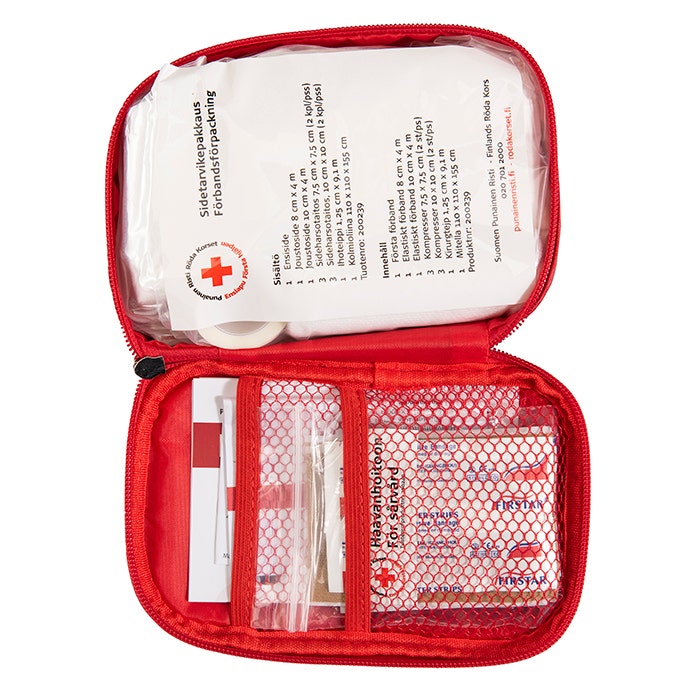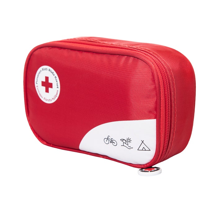 En behändig första hjälpen-väska i praktisk storlek, passar bra i en ryggsäck eller vandringsväska och innehåller allt du behöver för snabb första hjälpen i nödsituationer. Väskans innehåll har planerats och godkänts av Finlands Röda Kors första hjälpen-experter.