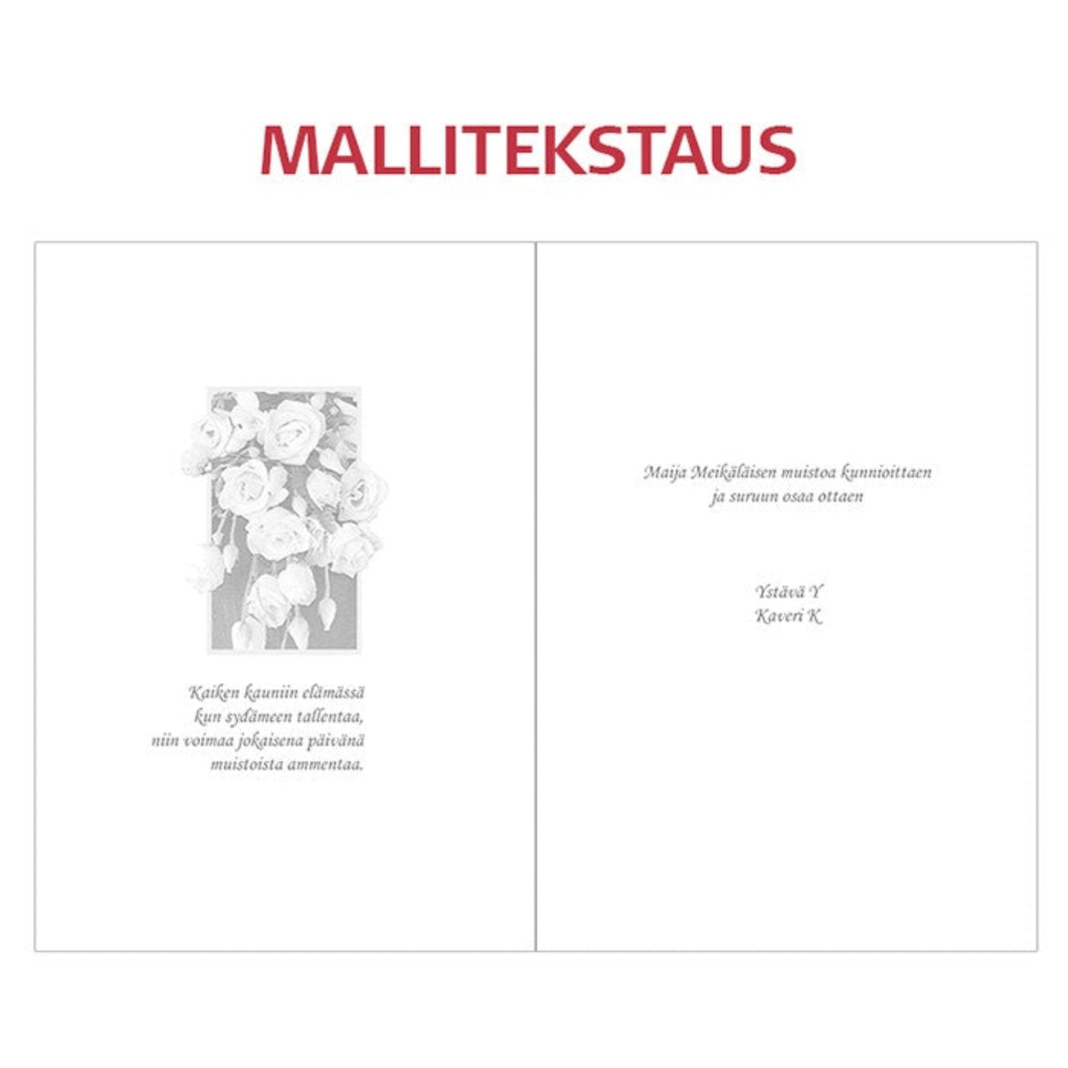 En textad adress förmedlar dina kondoleanser och ditt deltagande direkt till mottagaren. Priset för tjänsten inkluderar en kondoleansadress, med omslag och ett innerblad med din text och ett kuvert med Röda Korsets logo samt leverans via Matkahuoltos XXS-paket till postlådan eller brevinkastet.