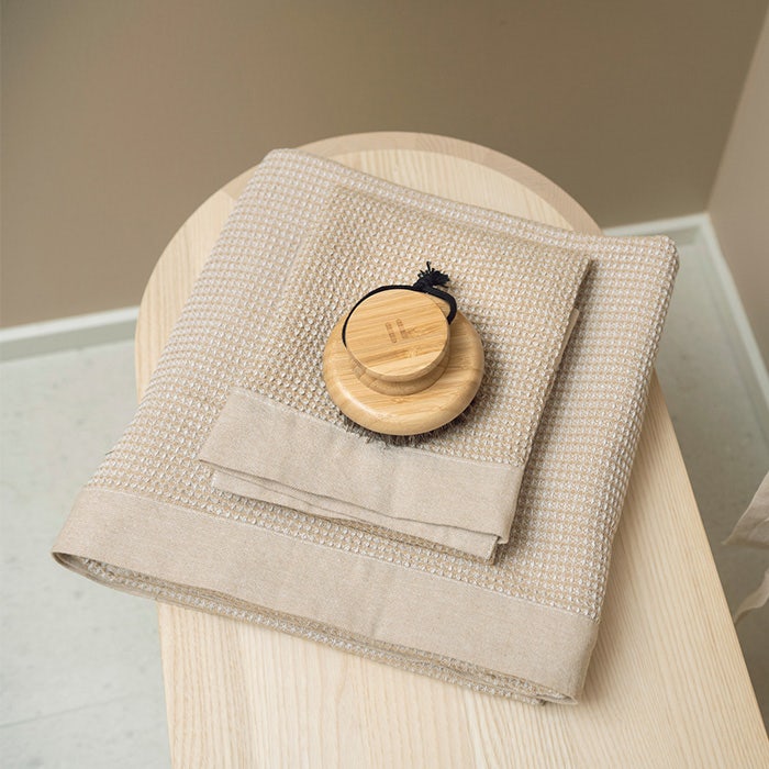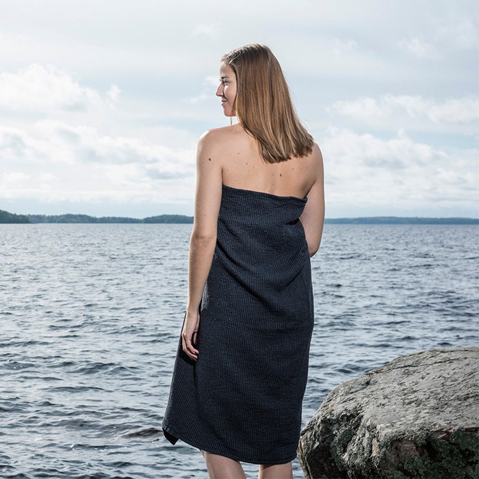 En skön, rymlig badhandduk med chambray-kantning. Kenno-bastutextilierna är tillverkade av återvunnet material och kännetecknas av... Lue lisää Näytä vähemmän