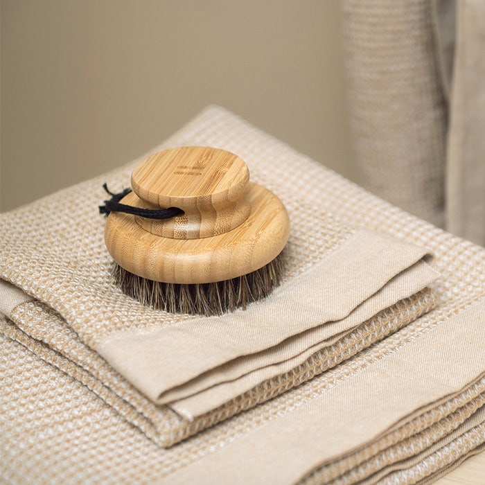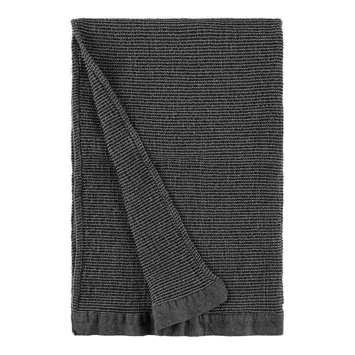 En skön, rymlig badhandduk med chambray-kantning. Kenno-bastutextilierna är tillverkade av återvunnet material och kännetecknas av tygets mjukhet och livfulla struktur.
