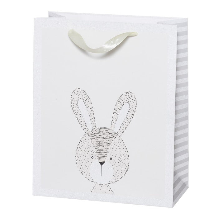 Papperspresentpåse med en söt kaninbild. Påsen är gjord av starkt 210gsm papper och har snörhandtag. Presentpåsen är hållbar och ett enkelt val för presentförpackning; du kan enkelt packa föremål med besvärliga former, och presentpåsen kan återanvändas.
