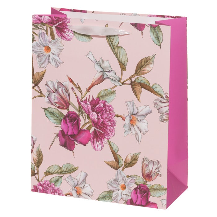 Papperspresentpåse med vackert blommönster. Påsen är gjord av starkt 210gsm papper och har snörhandtag. Det vackra blommönstret passar många olika mottagare. Presentpåsen är hållbar och ett enkelt val för presentförpackning; du kan enkelt packa föremål med besvärliga former, och presentpåsen kan återanvändas.