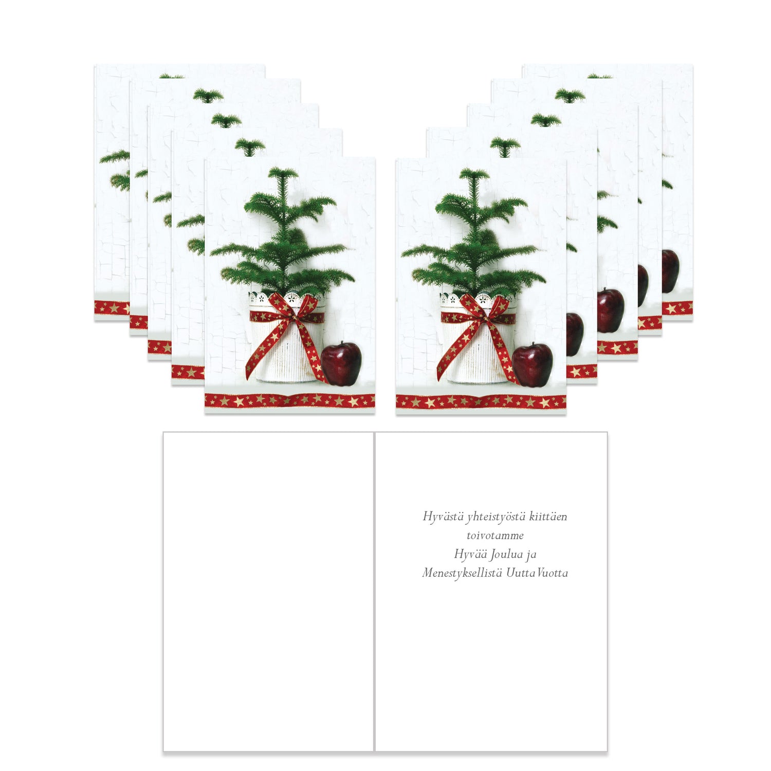 10 st vikta julkort, inga kuvert. Texten på korten på finska "Hyvästä yhteistyöstä kiittäen toivotamme Hyvää Joulua ja Menestyksellistä Uutta Vuotta".