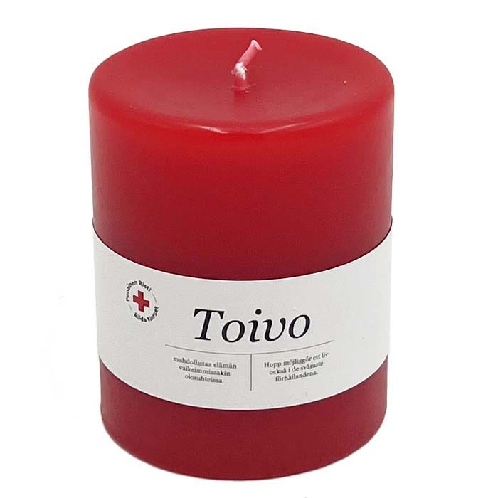 Det julröda Toivo-bordsljuset är underbart att ge som present. Etiketten har texten: Hopp möjliggör ett liv också i de svåraste förhållandena.