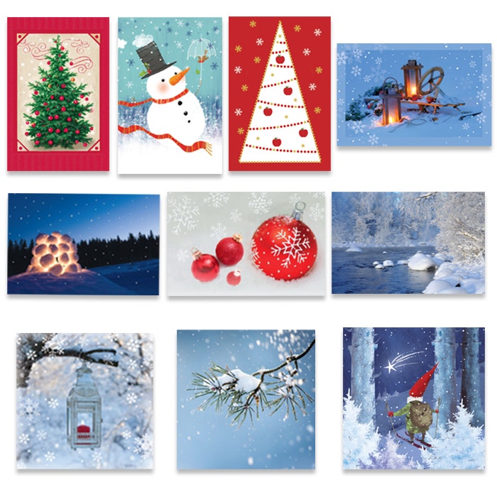Förpackning innehåller 10 olika vikta julkort utan text och 10 kuvert med porto betalt.
