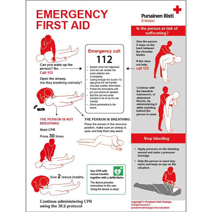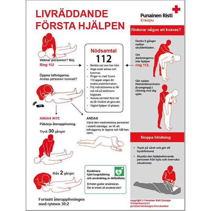 Tavlan innehåller grundläggande instruktioner för hjärt- och lungräddning, kvävning och blödningar. Dessutom finns det instruktioner för att ringa nödnumret och använda en defibrillator.