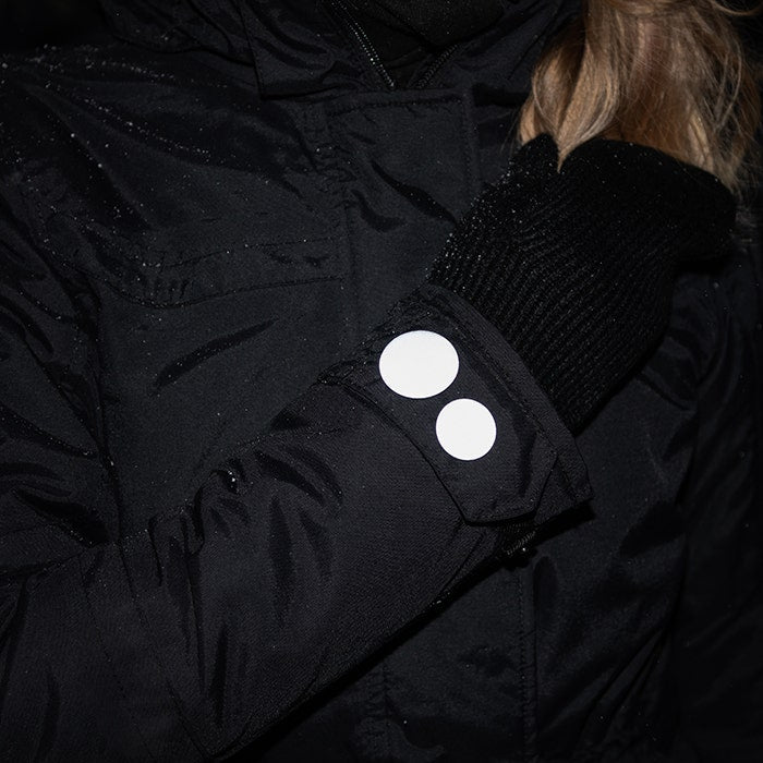 Pins täckta med reflekterande tyg är lätta att fästa på till exempel en jacka eller en väska.