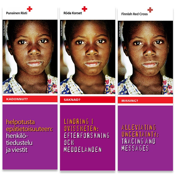 Esite kertoo miten Punainen Risti auttaa erilaisten katastrofien ja kriisitilanteiden erottamia perheitä. Etsimme kadonneita omaisia ja välitämme viestejä kriisialueilla. Kielivaihtoehtoina suomi, ruotsi ja englanti.