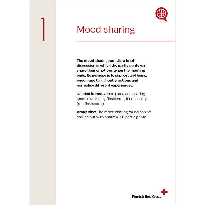 "Kort för gott humör" för volontärer är ett verktyg från Finlands Röda Kors som är utformat för att stötta gruppernas välmående och erbjuda volontärer olika övningar och innehållsidéer för gruppträffar. Innehållet kan även användas av professionella.