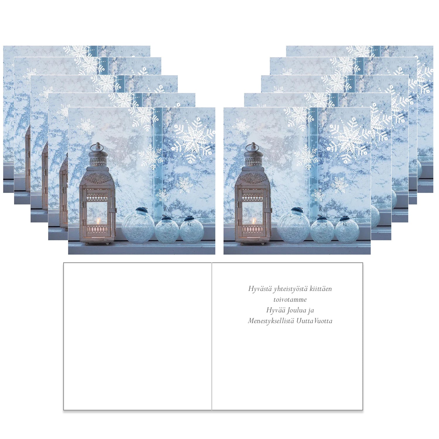 10 kpl 2-osaista joulukorttia. Korteissa joulutervehdys, jolla voit kiittää liike-elämän kumppaneita: "Hyvästä yhteistyöstä kiittäen toivotamme Hyvää Joulua ja Menestyksellistä Uutta Vuotta"