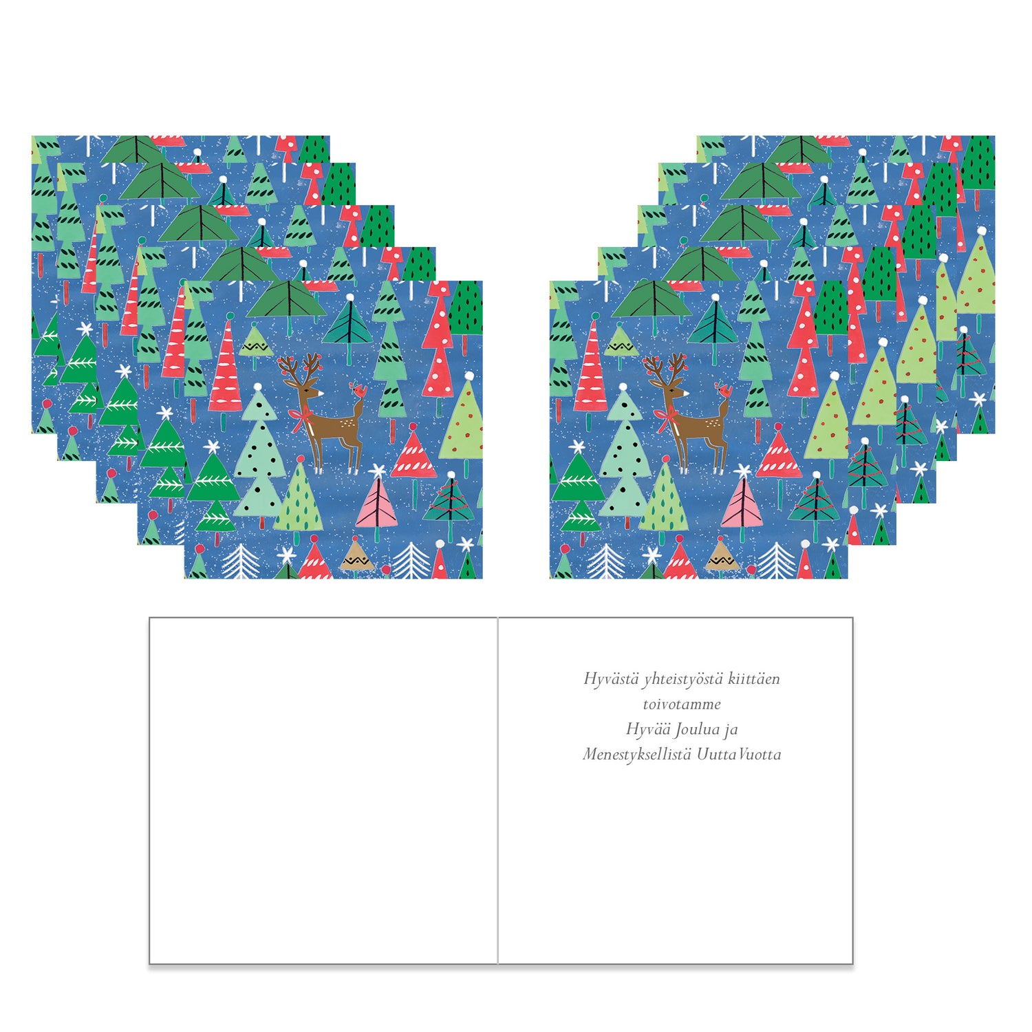 10 kpl 2-osaista joulukorttia. Korteissa joulutervehdys, jolla voit kiittää liike-elämän kumppaneita: "Hyvästä yhteistyöstä kiittäen toivotamme Hyvää Joulua ja Menestyksellistä Uutta Vuotta"