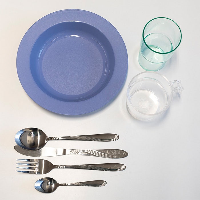 Mat serveringssetet innehåller kärl och bestick för en person. Det finns 1 st av varje produkt i satsen. Lämplig för mottagningscenter, ungas skyddshus och till exempel i händelse av brand eller annat akut boende. Satsen levereras i en väska.