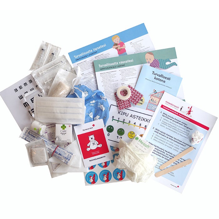 Nallesjukhusets förbrukningskit innehåller: gasbindarullar och kompresser sårtejp bomullspinnar små sprutor utan nål smärtskalan E-tavla för... Lue lisää Näytä vähemmän