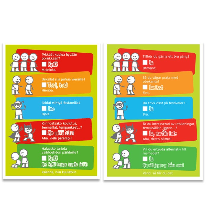 Kutsuu mukaan Punaisen Ristin päihdetyön toimijaksi. Jakomateriaali erilaissa toiminnan esittelytilanteissa tai kohdattaessa erityisesti nuoria aikuisia.