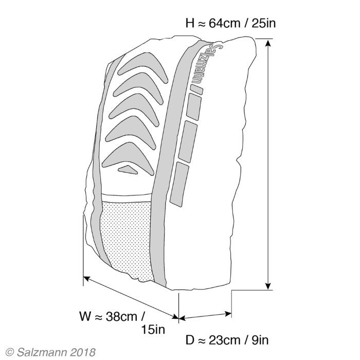 Tillverkad av 100% fluorescent polyester. 100% vattentät. Ljusreflektion: 600 cd / lyx / m2. Designad för vanliga ryggsäckar max 36 l. Tillverkad av Salzmann, Tyskland.