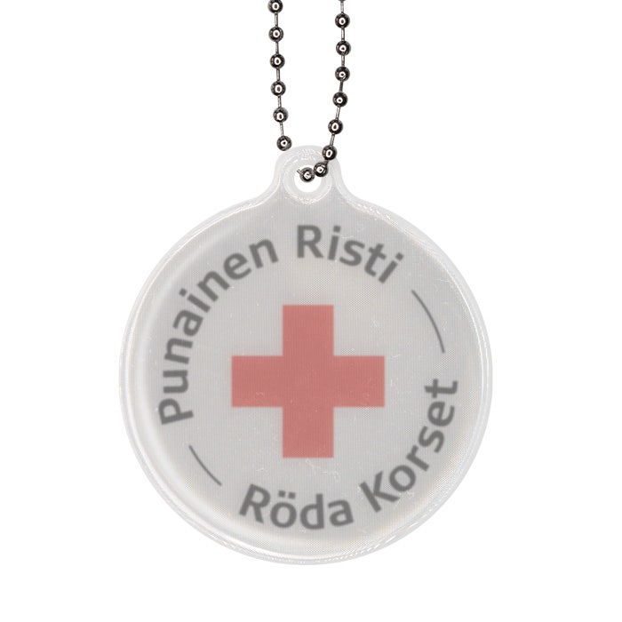 Inhemsk, högkvalitativ reflex med Röda Korsets logotyp. Tryck på båda sidor av reflektorn. Reflexen levereras med en kedja och ett papegojlås.
