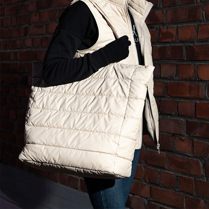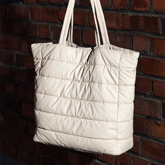 Den mjuka quiltade shoppingväskan kombinerar stil och praktisk. Den beige färgen passar perfekt till olika outfits och accessoarer. Tryckknappsförslutning. Yttvätt med en fuktig trasa.
