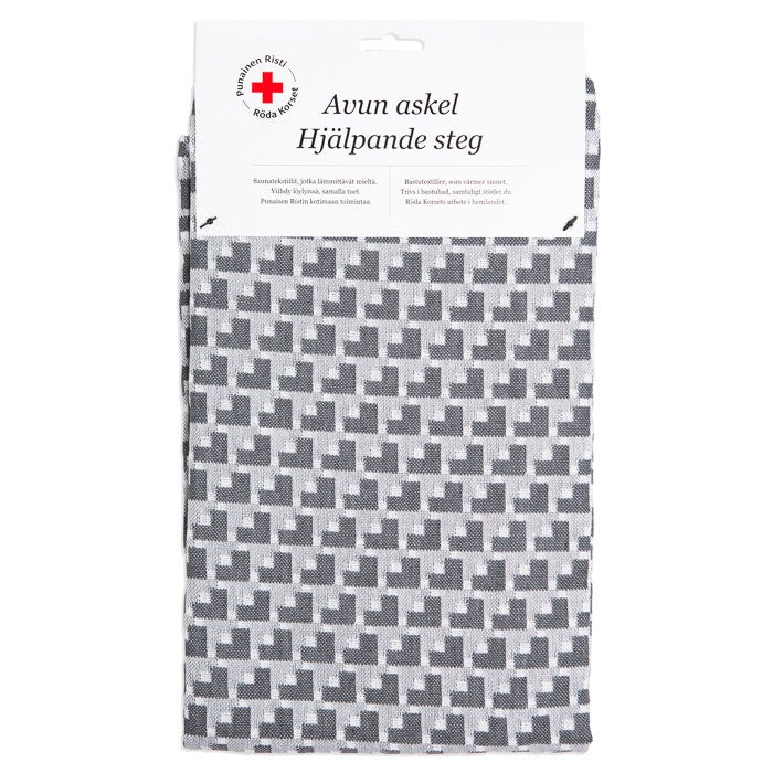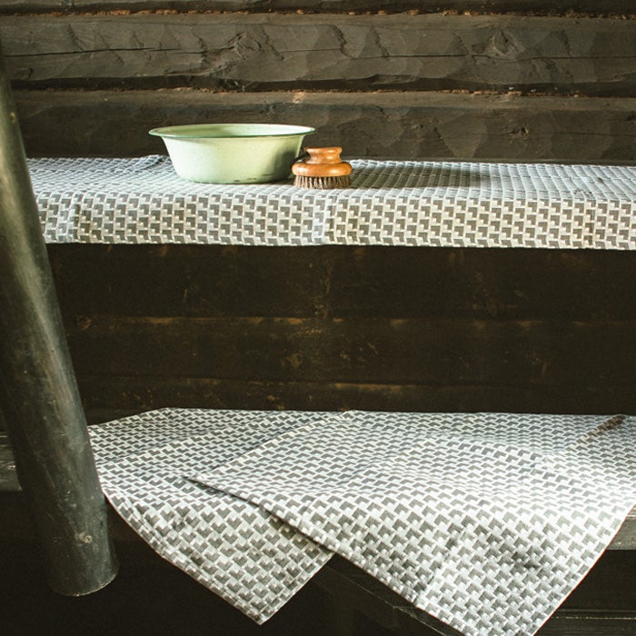 Det grå och vit vävda Hjälpens steg-mönstret gör denna bastutextil stilren och tidlös. Det är underbart att ge bort i present och att inreda sin egen bastu i stugan eller hemma. Finns endast hos oss!