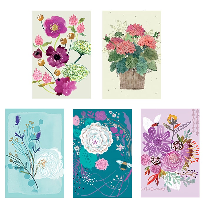 Paketet innehåller fem vackra vikta kort med blomtema och kuvert. Det finns inget porto på kuverten.