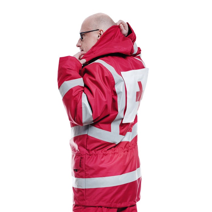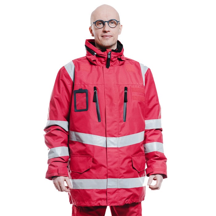 Päivystysasun takki talvikäyttöön. Vettä ja tuulta pitävä kangas, vetoketjulliset rinta- ja alataskut, kannelliset alataskut, korttitasku läpinäkyvällä muovilla, nimikyltille tarrat rinnassa, selässä tarrat selkämerkille. Heijastinnauhat helmassa, vyötäröllä ja hihoissa. Huppu kauluksessa, irrotettava tikkivuori, fleece-kaulus.