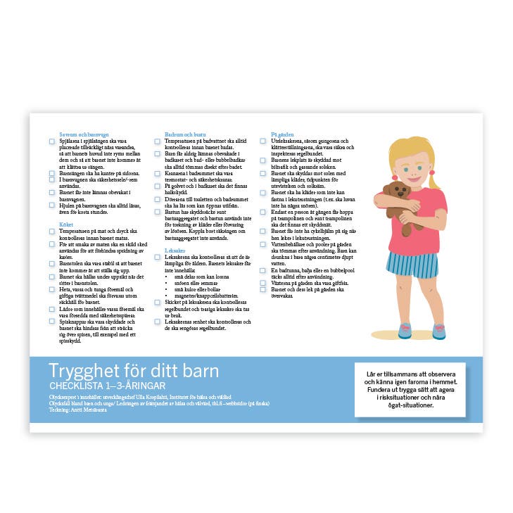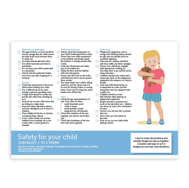 Tarkistuslista tapaturmien ehkäisyyn leikki-ikäisillä. 2-puoleinen. Tilataan lehtiöittäin, jossa 25 tarkistuslistaa. Lue lisää Näytä vähemmän