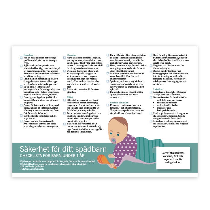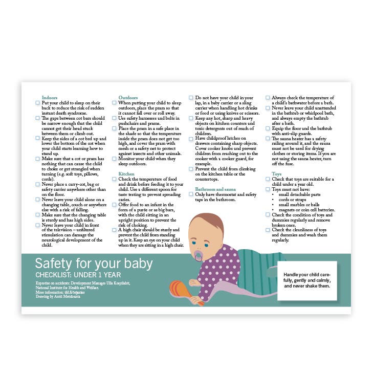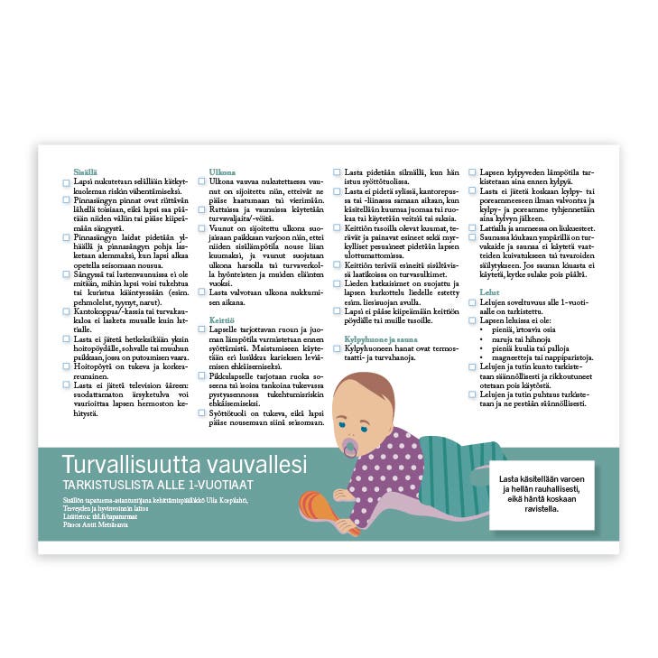 Tarkistuslista vauvojen tapaturmien ehkäisyyn. 2-puoleinen. Tilataan lehtiönä, jossa 25 tarkistuslistaa. Lue lisää Näytä vähemmän